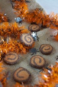 You can also make the dough log ahead of time and freeze it. I made it then realised my spiders for the photo hadn’t arrived so popped it in the freezer. The spiders never arrived sadly so I had to find a substitute which I have to say I probably like better. Who knew there was Halloween tinsel? Enjoy!